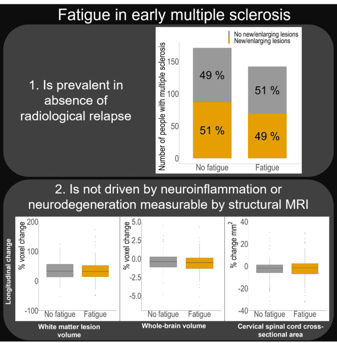 In their study, Dr Rozanna Meijboom and colleagues present findings from the large, longitudinal, multi-centre FutureMS study, led by the Anne Rowling Clinic. Their results show that, in individuals newly diagnosed with MS, fatigue cannot be readily explained by structural imaging measures of inflammation or neurodegeneration.